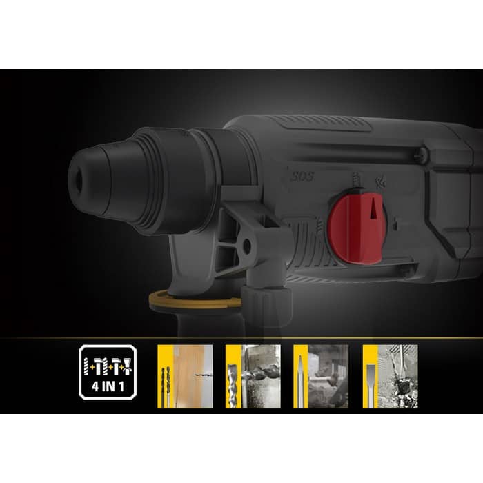 - Επιπλέον, διαθέτει 4 λειτουργίες: τρυπάνι, σφυρί, περιστροφή μύτης και λείανση