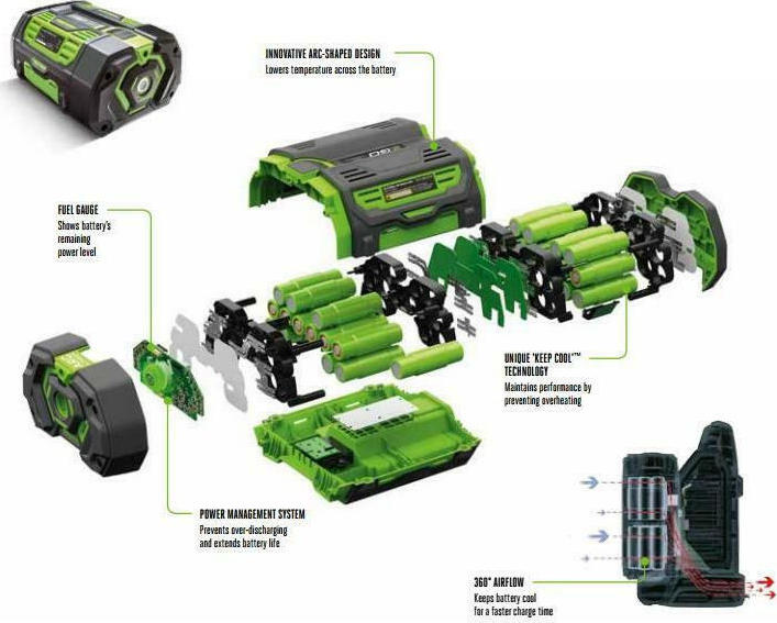 Το καινοτόμο σχήμα τόξου καταπολεμά την υπερθέρμανση και μεγιστοποιεί το χρόνο λειτουργίας, ώστε να μπορείτε να συνεχίσετε για μεγαλύτερο χρονικό διάστημα. Όταν έρθει η ώρα της επαναφόρτισης, ο ταχυφορτιστής EGO Power+ είναι ο ταχύτερος της αγοράς. Από το άδειασμα της μπαταρίας μέχρι το γέμισμά της, όταν χρησιμοποιείτε τον γρήγορο φορτιστή, θα χρειαστούν μόλις 40 λεπτά, ενώ όταν χρησιμοποιείτε τον κανονικό φορτιστή, 100 λεπτά.